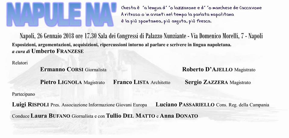 Venerdì 26 gennaio 2018, alle ore 17.30, nella Sala Congressi di Palazzo Nunziante, in via Domenico Morelli,7 si terrà il Convegno dal titolo "Napule Na’ Chesta è ‘a lengua d’ ‘o lazzarone e d’ ‘o marchese de Caccavone. A ritroso o in avanti nel tempo la parlata napuletana è la più spontanea, più arguta, più fresca", conferenza a cura di Umberto Franzese.