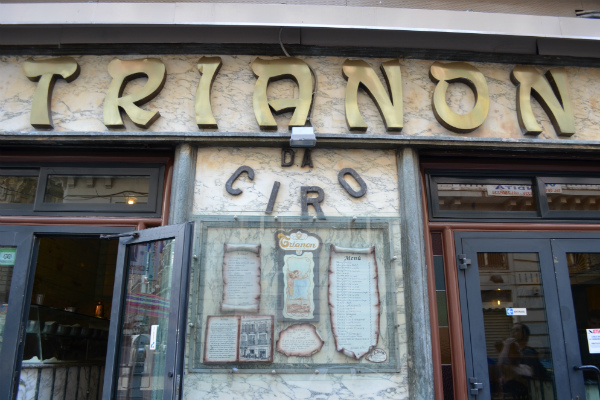La pizzeria Trianon da Ciro prende il nome dal famoso teatro in cui si esibivano personaggi come Totò, Macario e Nino Taranto. Dopo lo spettacolo gli attori venivano tutti a gustare le pizze in quella che non a caso è considerata la pizzeria degli artisti. Il locale si sviluppa su tre piani, ognuno con il proprio forno , e nasce in un periodo storico a cavallo tra le due guerre mondiali; per sfamare il popolo viene creata la pizza “a ruota di carretta”, con circa 35 cm di diametro, in grado di soddisfare l’appetito di un’intera giornata. In carta oggi campeggiano, oltre alla Margherita e Marinara, anche molte varianti: con fiordilatte, con mozzarella di bufala campana dop, con filetto di pomodoro, con uova, con funghi, alla romana, con prosciutto e funghi, con panna, con salsiccia e friarielli, con salsiccia e funghi . E poi la Gran Trianon da otto gusti, che non è mai la stessa, perché fatta con i prodotti freschi di stagione. Tutti gli ingredienti sono a marchio Dop e provenienti dal territorio, fatta eccezione per i salumi. L’impasto ha unalievitazione di circa 12 ore. Il Trianon oggi è anche a Salerno in piazza Flavio Gioia e a Sorrento. Nelle sedi Trianon non esistono giorni di chiusura, le pizzerie sono sempre sempre aperte, a pranzo e a cena.
