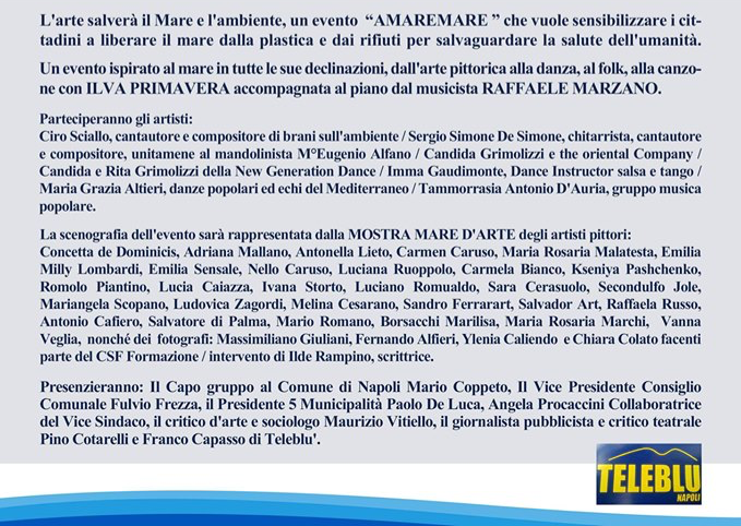 L' Associazione Primavera Arte di Ilva Primavera presenta, nell'ambito della rassegna "Stati Generali del Mare 2019" l’evento “ AMAREMARE”,ovvero l'invito a liberare il mare e l’ambiente dalla plastica, Mostra d’arte collettiva : MARE D'ARTE I rifiuti che diventano arte,interventi musicali e di danza varia.